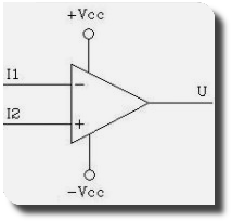 Si può notare che il disegno è formato da un triangolo in cui convergono due morsetti di ingresso I1 e I2, uno marcato con il simbolo -, l’altro con il simbolo +. Questi due simboli + e - , non indicano i morsetti d’alimentazione ma bensì il tipo di trattamento che subirà il segnale all’interno dell’amplificatore. Di fatto se applicheremo il segnale all’ingresso non invertente (morsetto +) esso verrà solo amplificato, se invece lo applichiamo all’ingresso invertente (morsetto -), il segnale subirà un processo d’amplificazione e d’inversione di polarità.
