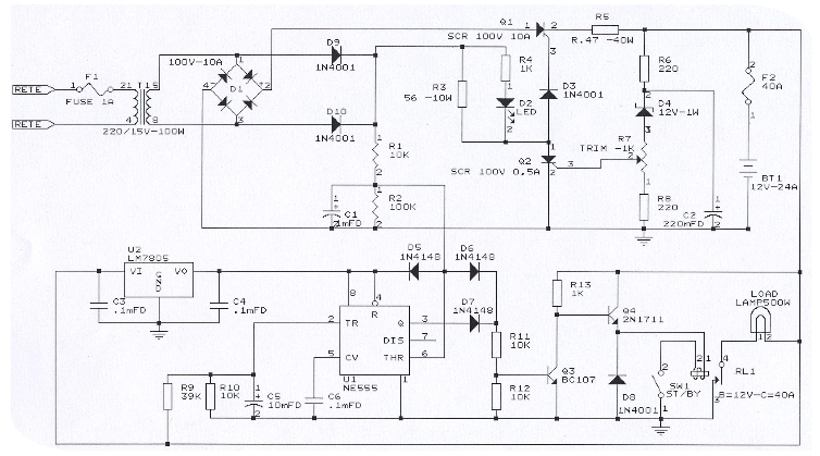 Il circuito e’ composto da una batteria che svolge la funzione di generatore d’emergenza a 12V. La batteria viene mantenuta carica dal caricabatteria già descritto nell’articolo del caricabatteria stabilizzato ( consiglio di sfogliare l’articolo ciccando sul link per capirne il funzionamento ).